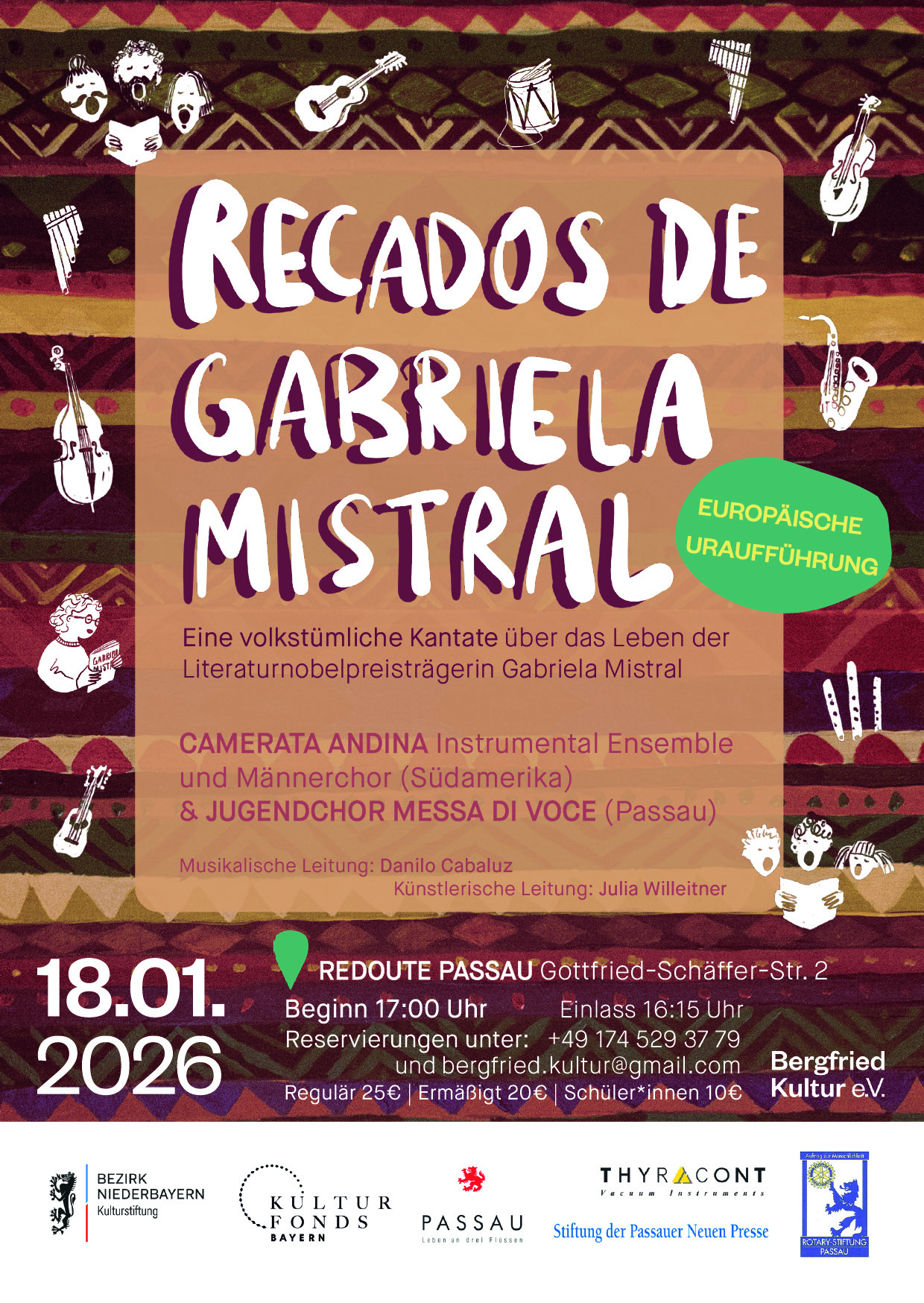 Neben klassischen europäischen Instrumenten bereichern zahlreiche traditionelle südamerikanische Volksinstrumente den Abend und bringen den authentischen Klang der Anden nach Passau – ein musikalisches Erlebnis voller lateinamerikanischer Farben, poetischer Tiefe und kultureller Begegnung.